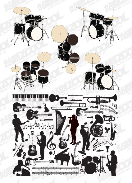 eps tormat??Keyword: vector material, vector instruments, percussion, music, speakers, silhouettes, singing and playing keyboard, guitar, piano, violin, drum notes, all kinds of musical instruments