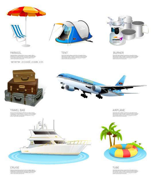 ai formats, including jpg preview, keyword: Vector icon, beach chairs, sun umbrellas, tents, outdoor tableware, luggage, aircraft, ships, yachts, vacation, swimming, coconut trees, islands, water, vector material