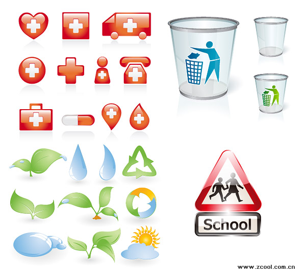 eps format, including jpg preview, keyword: Vector icon, heart-shaped, medical, ambulance, Cross, pills, kits, phone, vista trash, leaves, germination, growth, water droplets, water, environmental protection , sun, clouds, schools, road signs, road signs, vector material